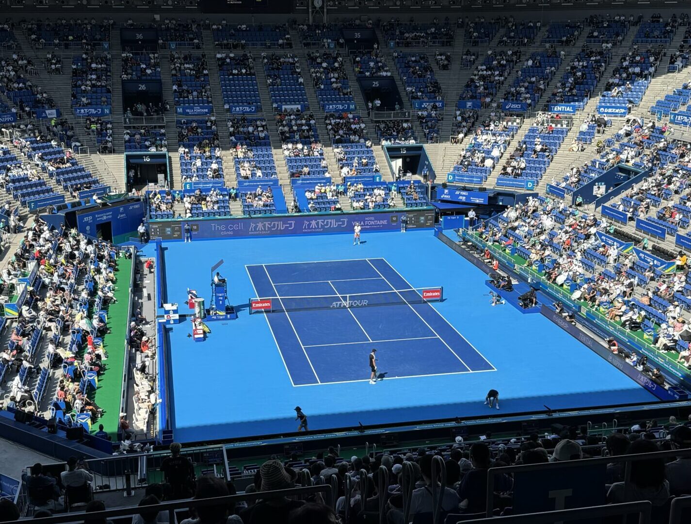 第2試合はアレクサンダー・ズベレフと初出場のベン・シェルトンの対戦。両社とも高身長ながら俊敏な動きで鋭いショットを繰り出します。第5ゲームでドロップショットを見事に返球したズベレフがブレークします。第9ゲームでもネットに出てきたシェルトンにミスを誘い、ズベレフが第1セットをものにしました。第2セットはお互いに堅実なサービスキープを続けます。途中ズベレフにチャンスがきますがシェルトンが驚異的なタッチでしのぎました。タイブレークに突入するとシェルトンの強烈なフォアハンドが炸裂。セットポイントを3つ握りましたが、その後ミスが目立ちズベレフのストレート勝利となりました。